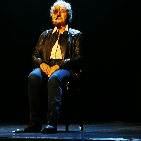 Brigitte entre à cour avec le masque, va chercher sa chaise en avant-scène cour et la positionne